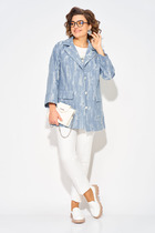 Длина жакета по спинке около 69 см в размерах 40-46 и около 72 см в размерах 48-52, длина рукавов около 62 см. Длина брюк по боковому шву с поясом около 113 см в размерах 40-46 и около 114,5 см в размерах 48-52, длина по внутреннему шву около 82 см.