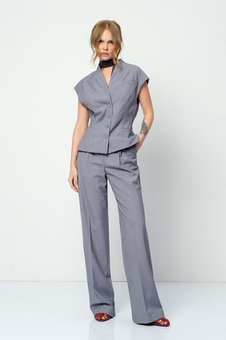 Костюм-двойка из приталенного жилета с воротником-стойкой и широких прямых брюк.