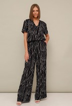 Текстильный костюм-двойка из приталенного жакета фурнитурой под золото и укороченных брюк со стрелками. Детали: пиджачный воротник, нагрудные вытачки, прорезные карманы с фигурными клапанами, рукава втачные со шлицей, съемный пояс, жакет на подкладке; брюки со средней посадкой на притачном поясе, на передних половинах складки и заутюженные стрелки, застежка на молнию и пуговицу, боковые карманы.