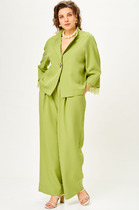 Детали: блуза прилегающего силуэта, талиевые вытачки по переду и спинке, цельнокроеная горловина стойка, потайная молния в среднем шве спинки, блуза на подкладке. Брюки с высокой посадкой на притачном эластичном поясе, без застежки, боковые карманы, низ брюк с эластичными манжетами, брюки на хлопковой подкладке.