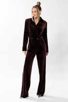 Костюм женский состоящий из блузы и брюк. Блуза свободного силуэта с центральной застежкой на петли пуговицы. Рукав цельнокроеный широкий, длиной от горловины 51 см. Воротник стояче-отложной. По боковым швам расположены 2 разреза. Брюки свободного силуэта, широкие без бокового шва. Верх брюк на подкладке с цельнокроеным поясом на резинке. Длина изделия – 79 см, длина брюк по боку – 120 см