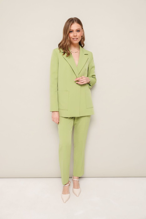 Комплект 2-предметный, состоящий из жакета и брюк, выполненный из костюмной ткани. Жакет прямого силуэта, с центральной застежкой на петлю и пуговицу. Воротник пиджачного типа с отложными лацканами. Спереди обработаны накладные карманы. Рукава втачные, двухшовные. Жакет на подкладке. Брюки прямого силуэта слегка зауженные к низу, с заутюженными стрелками и с боковыми наклонными карманами. Застежка на пуговицу и тесьму-молнию. Пояс притачной на резинке для регуляции размера. На задних половинках брюк обработаны карманы с листочками.