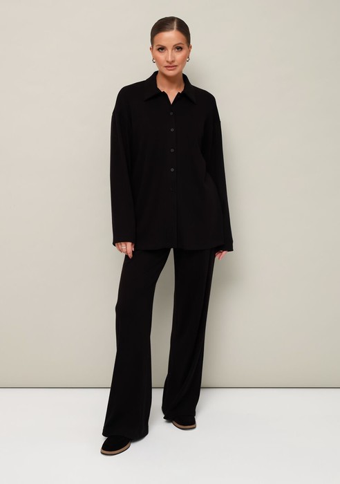 Комфортный брючный комплект с джемпером, выполнен из качественного трикотажного полотна. Джемпер прямого силуэта. Горловина с отложным воротником. Центральная застёжка на петли и пуговицы. Длинные рукава со спущенной линией втачивания плеча. Брюки прямого кроя с посадкой на талии. Пояс обработан эластичной резинкой.