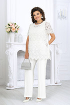 Комплект женский, состоящий из блузки и юбки. Блузка свободного кроя, длиной до бедер. Спинка со средним швом, в котором по горловине обработана застежка на навесную петлю и пуговицу. По переду нагрудные вытачки. Блузка без рукавов, с фигурной проймой. Горловина округлой формы. Юбка прямого силуэта, длиной чуть ниже щиколотки. Заднее полотнище с талиевыми вытачками и средним швом. Переднее полотнище со средним швом, в котором обработан высокий разрез, с боковыми карманами с наклонным входом с клапанами. На клапанах пришиты пуговицы. В среднем шве переда обработана застежка на тесьму-«молнию» с гульфиком и откоском. юбка на притачном поясе с фигурным уступом по переду, с резинкой по спинке. По поясу вставлены шлевки. Пояс с застежкой на петлю и пуговицу. По поясу застежка на петлю и пуговицу.