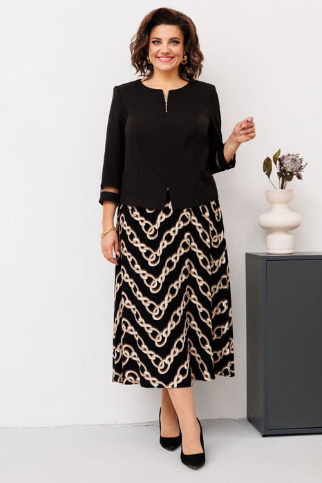 Костюм предназначен для повседневной носки. Костюм женский 2-х предметный блузон и юбка. Блузон полуприлегающего силуэта, длиной до линии бёдер. Перед с 2-мя отрезными бочками, со средним швом, заканчивающимся разрезом. Спинка со средним швом. Горловина круглая, обточная, без воротника. Застёжка на втачную металлическую молнию в среднем шве переда. Рукав втачной, 2-х шовный, длиной 3/4, внизу с горизонтальным подрезом, отделочной вставкой из еврофатина. Блузон с плечевыми накладками. Юбка длиной до нижней части икры расклешённая к низу из отделочнойткани. Переднее и заднее полотнища цельнокроенные. Юбка с притачным поясом, собранным на эластичную тесьму. Юбка без подкладки. К костюму прилагается обтачной пояс, фиксирующийся на обтяжную пряжку и 5-ть пробивных блочек. Длина спинки блузона 54,5 см, длина рукава 42 см. Длина юбки по боковому срезу 81 см.
