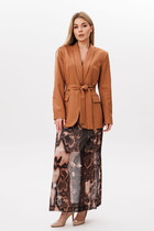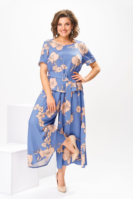 Костюм женский предназначен для повседневной носки. Костюм женский 2-х предметный блузка и юбка-брюки. Блузка женская прямого силуэта, длиной до линии бёдер. Перед с 2-мя нагрудными вытачками. Спинка с отрезной кокеткой, с 1-ной встречной складкой, кокетка декорирована пришивной металлической пластиной. Боковые швы с разрезами. Горловина круглая, обточная, без воротника. Рукав втачной одно шовный, короткий, с приточной отложной манжетой. Блузка без плечевых накладок. Юбка-брюки длинные широкие. Передние половинки с карманами в боковых швах с 2-мя односторонними зафиксированными складками на каждой половинке. Задние без конструктивных особенностей. Пояс притачной, собран на эластичную тесьму, закреплённую 2-мя отделочными строчками. Длина брюк по боковому срезу 90 см. Длина спинки блузона 56 см, длина рукава 22 см.