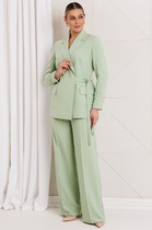 Костюм женский предназначен для повседневной носки. Костюм женский 2-х предметный блузка и юбка-брюки. Блузка женская прямого силуэта, длиной до линии бёдер. Перед с 2-мя нагрудными вытачками. Спинка с отрезной кокеткой, с 1-ной встречной складкой, кокетка декорирована пришивной металлической пластиной. Боковые швы с разрезами. Горловина круглая, обточная, без воротника. Рукав втачной одно шовный, короткий, с приточной отложной манжетой. Блузка без плечевых накладок. Юбка-брюки длинные широкие. Передние половинки с карманами в боковых швах с 2-мя односторонними зафиксированными складками на каждой половинке. Задние без конструктивных особенностей. Пояс притачной, собран на эластичную тесьму, закреплённую 2-мя отделочными строчками. Длина брюк по боковому срезу 90 см. Длина спинки блузона 56 см, длина рукава 22 см.
