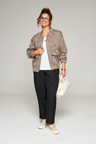 Костюм женский предназначен для повседневной носки. Костюм женский 2-х предметный блузон и юбка-брюки. Блузон прямого силуэта, длиной до линии бёдер с низом "ступенька". Перед с 2-мя нагрудными вытачками. Спинка цельнокроеная. Горловина круглая, обточная, без воротника. Рукав втачной, 2-х шовный, длиной 3/4. Блузон без плечевых накладок. Юбка-брюки длинные, широкие. Передние половинки с карманами в боковых швах с 2-мя зафиксированными односторонними складками с каждой стороны. Задние половинки без конструктивных особенностей. Юбка-брюки с приточным поясом, собранным частично на эластичную тесьму, закреплённую 2-мя отделочными строчками. К костюму прилагается съёмный пояс с пряжкой и 2-ю пробивными блочками. Длина брюк по боковому срезу 93см. Длина спинки блузона 64 см, длина рукава 49 см.