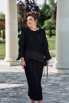 Костюм женский, 2-х предметный, блузка и брюки. Блузка женская, прямого силуэта, длиной ниже линии бёдер, с фигурным низом "ступенька". Перед цельнокроенный, с настрочным декором слева, с настрочной отделочной тесьмой. Спинка цельнокроенная. Горловина круглая, обточная, без воротника, длиной до локтя с притачной манжетой из отделочной ткани. Боковые швы с разрезами. Блузка без плечевых накладок. Брюки женские, прямые, длинные. Передние половинки с карманами в боковых швах. Задние половинки без конструктивных особенностей. Брючки с притачным поясом, собранным на эластичную тесьму (частично) и закреплённую 2-мя отделочными строчками. Длина спинки блузки 68,5 см, длина рукава 49 см. Длина брюк 105 см.