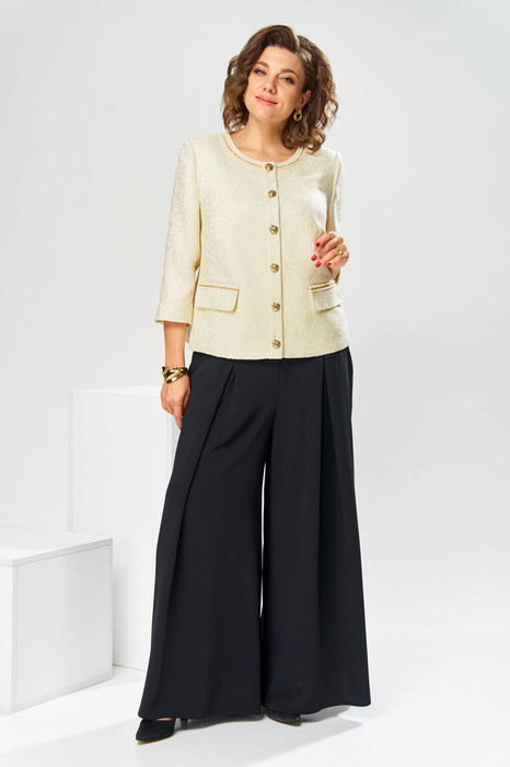Костюм женский относится к нарядной торжественной одежде. Костюм женский 2-х предметный жакет и брюки. Жакет женский полуприлегающего силуэта, длиной до линии бёдер. Перед с 2-мя нагрудными вытачками с притачными планками по горловине, декорированными надстрочной отделочной тесьмой, с 2-мя надстрочными вертикальными планками, с 2-мя прорезными карманами с клапаном с закруглёнными концами и листочкой, клапан декорирован надстрочной отделочной тесьмой, карманы расположены ниже линии талии на 2 см. Спинка с 2-мя таллиевыми вытачками и средним швом. Горловина круглая, обточная, без воротника. Застёжка центральная бортовая на 6-ть вертикально обмётанных петель и 6-ть пришивных пуговиц. Рукав 2-х шовный втачной, длиной 3/4. Жакет на притачной подкладке. Брюки женские, широкие, длинные. Передние половинки со встречными складками с карманами в боковых швах. Задние половинки без конструктивных особенностей. Брюки с притачным поясом, собранным на эластичную тесьму, закреплённую 2-мя отделочными строчками. Длина спинки жакета 58 см, длина рукава 48 см. Длина брюк по боковому срезу 99 см.