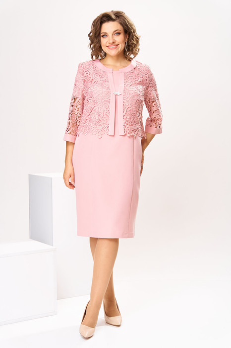 Комплект женский, относится к торжественно-нарядной одежде. Комплект женский, 2-х предметный, жакет и платье. Жакет женский прямого силуэта, длиной до линии талии, выполнен из кружевного полотна. Перед с 2-мя нагрудными вытачками, с 2-мя притачными вертикальными планками, с притачными планками по горловине. Спинка с притачной планкой по горловине. Горловина круглая, обточная, без воротника. Застёжка на декоративный пришивной крючок. Рукав втачной одно шовный, длиной 3/4 с притачной манжетой. Жакет без плечевых накладок. Платье женской длиной за колено, полу прилегающего силуэта. Перед с 2-мя отрезными бочками. Спинка с 2-мя таллиевыми вытачками, со средним швом, заканчивающимся шлицей. Горловина круглая, обточная, без воротника. Застёжка на потайную тесьму-молнию в среднем шве спинки. Рукав втачной, короткий, одно шовный. Платье с плечевыми накладками. Длина спинки жакета 45 см, длина рукава 41 см. Длина спинки платья 100 см, длина рукава 19 см.