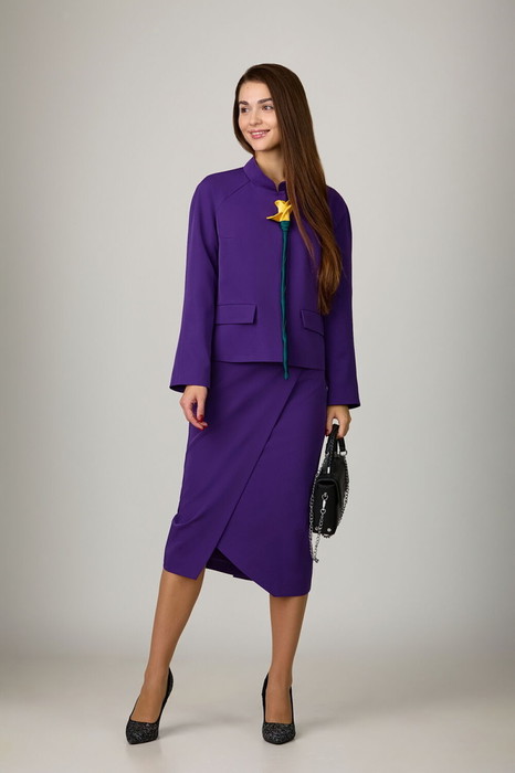Комплект из костюмной ткани на подкладке, состоящий из жакета и юбки. Жакет прямого силуэта с нагрудными вытачками и прорезными карманами с клапанами. Воротник - стойка. Рукава - реглан, длинные. Жакет застегивается на пришивные кнопки. Цветок ручной работы, расположение можно поменять самостоятельно. Юбка на подкладке, с отлетной деталью и поясом-обтачкой. В среднем шве заднего полотнища юбки - застежка-молния и разрез.