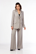 Брючный комплект из костюмной ткани на подкладке. Двубортный жакет выполнен в стиле оверсайз.  Воротник-с отложными лацканами пиджачного типа, рукава - двухшовные. По переду- прорезные карманы  с клапанами. Жакет имеет  два ряда пуговиц, застегивается на две основные пуговицы, одну потайную, остальные пуговицы несут декоративный характер.  Брюки-клеш  расширены к низу, с началом расширения выше колена 5 см. Брюки с двумя карманами и поясом-обтачкой.  Застегиваются на молнию по переду и  одну пуговицу.