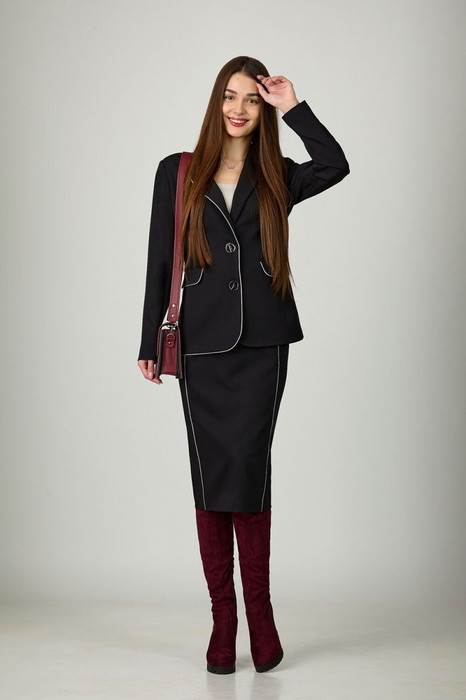 Комплект из костюмной ткани на подкладке, состоящий из жакета и юбки. Жакет приталенного силуэта с прорезными карманами с клапанами по переду. Воротник-английский, рукава - двухшовные. Застегивается на две пуговицы.  Юбка на подкладке, слегка зауженная к низу, с рельефами и поясом. Ширина пояса регулируется резинкой. В среднем шве заднего полотнища юбки - застежка-молния и шлица. Кант  цвета серебра по краю борта, клапанам  жакета и рельефам юбки.