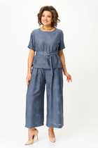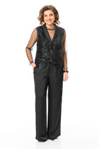 Комплект женский, состоящий из жакета и юбки, выполнен  из стрейчевой  костюмной ткани на подкладке.    Жакет полуприталенного  силуэта с рельефами по переду и спинке, отрезной по линии талии, с баской. Карманы-эмитация. Воротник - пиджачного типа. Рукава - втачные,  двухшовные.  Застежка на 2 пуговицы. Брошь ручной работы в виде цветка хризантемы.  Брюки слегка заужены к низу, с поясом.  Посадка- средняя.Застегиваются на молнию по переду и  одну пуговицу.