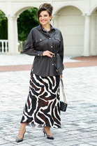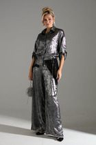 Брюки-клеш, плотно сидящие по фигуре , с началом расклешения 5 см выше колена. Брюки с карманами по переду и поясом-обтачкой. Застегиваются по переду на молнию и пуговицу.