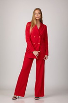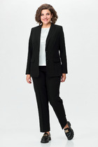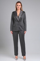 Брючный комплект из костюмной ткани на подкладке. Жакет двубортный. Воротник-с отложными лацканами пиджачного типа, рукава - двухшовные. Карманы прорезные с клапанами. Жакет застегивается на две основные пуговицы, одну потайную. Брюки слегка заужены к низу, с двумя наклонными карманами и притачным поясом. Величина пояса регулируется резинкой. Застегиваются на молнию по переду и одну пуговицу.