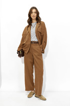 Двубортный жакет прямого силуэта с вытачками по переду. Карманы с листочками. Воротник - пиджачного типа. В среднем шве спинки - планка, застегивающаяся на пуговицы. Рукава - втачные, двухшовные. Застежка на 2 пуговицы и одну потайную. Цветок-брошь входит в комплект. Широкие брюки с поясом и карманами. По бокам пояса-резинка.Застегиваются по переду на молнию и пуговицу.