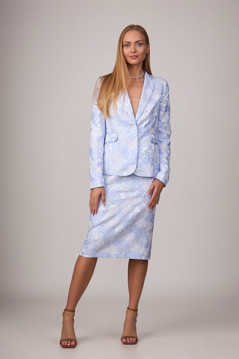 Комплект из костюмной ткани на подкладке, состоящий из жакета и юбки. Жакет приталенного силуэта с прорезными карманами с клапанами по переду. Воротник-английский, рукава - двухшовные. Застегивается на две пуговицы.