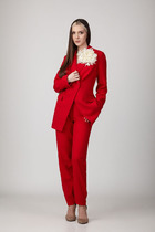 Пиджак из костюмной ткани на подкладке с расширенной линией плеч, с отрезными бочками по переду и спинке и вытачками по переду. Воротник-с отложными лацканами пиджачного типа. По переду - прорезные карманы с клапанами. Рукава длинные, двухшовные. Пиджак застегивается на три пуговицы.
