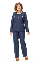 Комплект, состоящий из жакета и юбки,  из джинсовой ткани на подкладке.  Жакет с расширенной линией плеч, с отрезными бочками по переду и спинке и вытачками по переду. Воротник-с отложными лацканами пиджачного типа. По переду - прорезные  карманы  с клапанами. Рукава длинные, двухшовные. Жакет застегивается на три пуговицы. Юбка- миди с наклонными карманами и складкой по переду, с широким поясом-обтачкой. Застегиваются на молнию спереди и пуговицу.