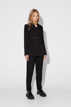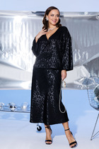 Комплект-двойка, состоящий из пиджака и юбки. Пиджак из костюмной ткани на подкладке с расширенной линией плеч, с отрезными бочками по переду и спинке и вытачками по переду. Воротник-с отложными лацканами пиджачного типа. По переду - прорезные карманы с клапанами. Рукава длинные, двухшовные. Пиджак застегивается на три пуговицы. Юбка - миди с наклонными карманами и складкой по переду, с широким поясом-обтачкой. Застегиваются на молнию спереди и пуговицу.