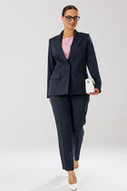 Комплект, состоящий из жакета и юбки из джинсовой ткани на подкладке. Двубортный жакет полуприталенного силуэта с отрезными бочками и вытачками по переду и спинке. Воротник-с отложными лацканами пиджачного типа. По переду - прорезные карманы с клапанами. Рукава длинные, двухшовные. Жакет застегивается на две пуговицы. Юбка прямая с наклонными карманами и разрезом по переду, с широким поясом-обтачкой. Застегиваются на молнию сзади.