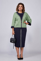 Брючный комплект из костюмной ткани на подкладке. Двубортный жакет полуприталенного силуэта с отрезными бочками и вытачками по переду и спинке. Воротник-с отложными лацканами пиджачного типа. По переду - прорезные  карманы  с клапанами. Рукава длинные, двухшовные. Жакет застегивается на две пуговицы. Брюки прямые со складкой, широким поясом-обтачкой, наклонными карманами. Застегиваются на молнию по переду  и пуговицу.