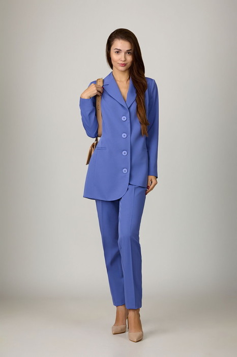 Стильная брючная пара из костюмной ткани на подкладке. Жакет слегка притален, с рельефами по переду и спинке и прорезными карманами с листочками по переду. Воротник-английский, рукава - двухшовные. Низ переда и спинки жакета асимметричен. Шлица на спинке декорирована пуговицами. Жакет застегивается на пуговицы. Брюки слегка заужены к низу, с поясом. Посадка-средняя.Застегиваются на молнию по переду и одну пуговицу.