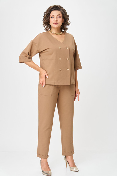 Костюм женский из трикотажной ткани. Джемпер женский из трикотажной ткани, прямого силуэта. По переду джемпера расположены настрочные карманы. Спинка прямая. Спущенное плечо. Рукав 3/4. Вырез горловины треугольный. Застежка двубортная на петлях-пуговицах.