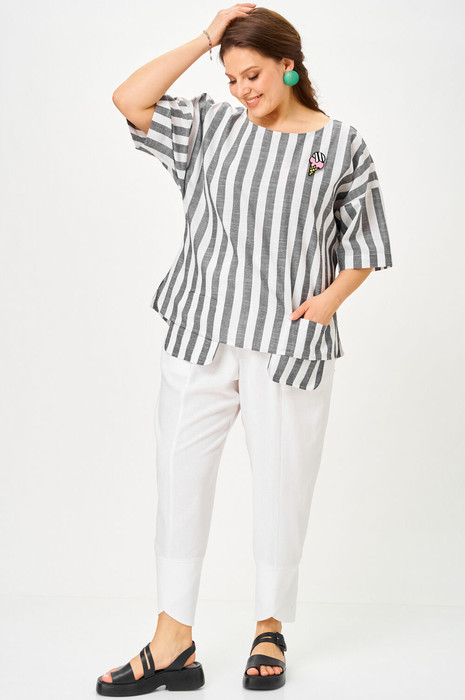 Брючный летний костюм больших размеров из льна. Будет идеальным летним вариантом для отдыха и просто на каждый день. Блузон свободного кроя и свободные в посадке укороченный брюки, оверсайз комплект на лето для женщин плюс сайз и для полных девушек. Дышащая ткань из смесового лен идеально подойдет для жаркого лета. Брюки свободные в посадке с круговой резинкой по поясу, шнурок в поясе позволит дополнительно скорректировать посадку по высоте. Функциональные карманы. Низ брюк на фигурной обтачке придает интересность и легкость, ножку делает более утонченной.