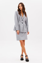 Жакет в стиле «Шанель» полуприлегающего силуэта с втачным рукавом, на трикотажной подкладке. Горловина округлой формы. Застежка центральная на пять обметанных петель и пять акцентных пуговиц. Перед с вытачками по линии груди, в нижней части декоративные карманы. По горловине, краю борта, низу жакета и рукавов отрезная планка.