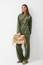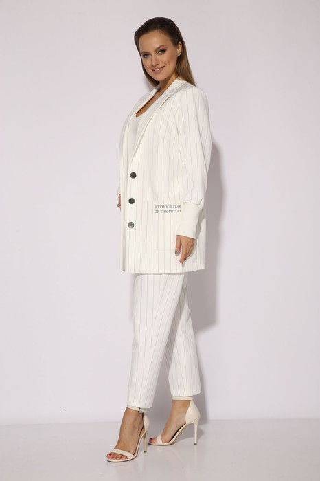Жакет женский, прямого силуэта с длинным рукавом. Рукав втачной с высокой манжетой по низу из эластичного трикотажного полотна. По переду нагрудные вытачки и накладные карманы. Застежка однобортная на петли и пуговицы. Воротник пиджачного типа, отложной с лацканами. Полочка и карман задекорированы печатным принтом. По спинке средний шов. Жакет на подкладке. Брюки женские, зауженные к низу типа бананы. По переду, в боковых швах наклонные функциональные карманы. Пояс притачной с резинкой. Топ прямого силуэта на бретелях.
