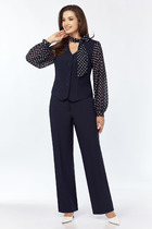 Комплект женский, 2х предметный, состоящий из футболки и брюк. Футболка прямого силуэта с коротким втачным рукавом. Вырез горловины круглой формы. По переду горизонтальный подрез. Верхняя часть задекорирована вышивкой. На спинке акцент в виде нашивки с элементом декоративной тесьмы. Брюки прямые, по низу с отворотом. По переду карманы и частичные защипы в области колена. Пояс притачной с резинкой по кругу и отделочной тесьмой спереди.