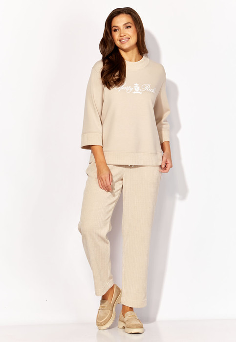 Комплект женский, 2х предметный, состоящий из джемпера и брюк, в сочетании двух видов трикотажного полотна. Джемпер прямого силуэта, с рукавом длинной 3/4. Рукав со спущенной линией плеча. По низу отрезная манжета. Горловина круглой формы, с широкой подрезной бейкой. По низу переда отрезная планка. Перед задекорирован принтом. Манжеты рукавов, бейка горловины и планка низа из отделочного трикотажного полотна. Спинка без особенностей. Брюки прямые. По переду наклонные карманы. Пояс притачной с резинкой и кулисой.