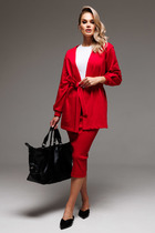 Костюм женский из гладкокрашеного трикотажного полотна футер-двунитка, состоящий из футболки и брюк. Футболка – классического покроя, с короткими втачными рукавами и горловиной овальной формы, обработанной втачной планкой. В нижней части полочки слева настрочен декоративный элемент прямоугольной формы.Брюки – длиной 7/8, слегка зауженные книзу, на притачном поясе с эластичной тесьмой внутри и карманами в боковых швах. Передние половины брюк застрочены по линиям центра вдоль на 0,3 см.