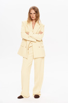Комплект из двух предметов: блуза и брюки. Блуза женская жакетного типа, полуприлегающего силуэта, выполнена из струящейся поливискозы. Блуза с центральной застёжкой на петли и пуговицы. Горловина оформлена воротником пиджачного типа. Правая деталь переда блузы с нагрудной выточкой, левая - с вертикальным рельефом и подрезом, в области груди обработана декоративная листочка. Спинка цельнокроенная с талиевыми выточками. Рукав втачной длинный, низ рукава обработан притачной манжетой, которая застёгивается на 2 петли и пуговицы. Брюки классической формы, прямого силуэта, со стрелками по передним и задним половинкам. Верхний срез обработан обтачным поясом, дополнен практичными шлевками для ремня. На задних половинках расположены талиевые вытачки с настрочными декоративными листочками. В боковых швах брюк обработаны наклонные карманы. Застёжка центральная на тесьму-молнию и крючок. Брюки комплектуются ремнем.