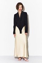 Костюм состоит из удлиненного жилета и брюк. Жилет без подкладки прямого силуэта с центральной бортовой застежкой на две петли-пуговицы, длиной ниже колена. Спинка с талиевыми вытачками, поясом и шлицей. Брюки классической формы, слегка заужены к низу, со стрелками по передним и задним половинкам. Верхний срез обработан притачным поясом, по спинке вставлена резинка для регулировки обхвата талии. По центру переда - застёжка на крючок и тесьму-молнию.