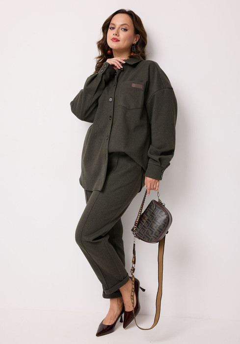 Комплект женский 2-х предметный, состоящий из блузы и брюк. Блуза выполнена из поливискозы с принтом "елочка". Блуза длиной до середины бедра, прямого силуэта, с центральной застёжкой на петли и пуговицы. Горловина рубашечного типа. Блуза со спущенной линией плеч. Рукава длинные, по низу обработана шлица и притачные манжеты, которые застёгиваются на 2 петли и пуговицы. На одной манжете настрочена декоративная нашивка. В области груди, с одной стороны, накладной карман с декоративной нашивкой. Спинка с кокеткой и со средним швом, в котором обработана шлица, застегивающаяся на 3 петли и пуговицы. Низ блузы закруглен. Брюки  выполнены из полизивкозы однотонного компаньона. Брюки прямого силуэта, слегка заужены к низу. Низ брюк с цельнокроеной манжетой. Брюки с отстроченными по переду стрелками и заутюженными по задним половинкам. Верхний срез обработан притачным поясом, в который вставлена резинка. По центру переда - застёжка-обманка. В боковых швах расположены наклонные карманы.