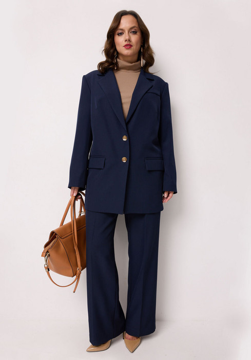 Элегантный костюм-тройка, состоящий из жакета, джемпера и брюк. Жакет и брюки выполнены из костюмной ткани, джемпер — из трикотажного полотна. Жакет прямого силуэта, с застежкой на две петли и две пуговицы. Перед жакета с нагрудной вытачкой, с прорезными карманами в рамку с клапаном. Спинка жакета со средним швом, заканчивающийся шлицей, левая часть спинки с прорезным карманом в рамку, вход в который фиксирует навесная петля с пуговицей. Рукава двухшовные втачные. Горловина оформлена воротником пиджачного типа. Джемпер прямого силуэта, выполнен из вискозы. Перед и спинка цельнокроенная. Рукав длинный. Горловина типа "водолазка". Длина изделия - середина бедра. Брюки классической формы, прямого силуэта, со стрелками по передним и задним половинкам. Верхний срез обработан обтачным поясом. На задних половинках расположены талиевые вытачки, с декоративными листочками. В боковых швах брюк - наклонные карманы. Застёжка центральная на тесьму молнию и крючок.