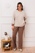 Костюм женский 2-х предметный, состоящий из жакета и брюк. Жакет полуприлегающего силуэта, на подкладке, с одноботной застежкой на петли и пуговицы. Горловина жакета оформлена воротником пиджачного типа. В области бедер обработаны прорезные карманы "в рамку" с клапаном. Спинка жакета со средним швом, заканчивающийся шлицей, левая часть спинки с прорезным карманом в рамку, вход в который фиксирует навесная петля с пуговицей. Брюки формы "палаццо" со стрелками. Верхний срез обработан притачным поясом с резинкой в области спинки. По центру переда - застёжка на крючок и тесьму-молнию. В боковых швах расположены наклонные карманы.