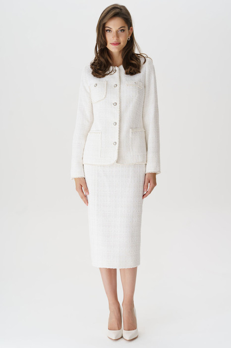 Костюм женский из костюмно-плательной ткани типа Chanel, состоит из жакет полуприлегающего силуэта на подкладке, и юбки-карандаш на подкладке. Костюм может использоваться и как для нарядной, так и для повседневной носки. Жакет женский с центральной бортовой застёжкой до верха на 5 петель и пуговиц (размер и цвет фурнитуры может незначительно отличаться от фото) и отделочной тесьмой с жемчугом, идущей по горловине, вдоль борта, карманам, низу изделия и низу рукавов. Перед жакета с рельефными швами, выходящими из проймы до низа  и талиевыми вытачками. Правая полочка с двумя накладными карманами, нижний с прямыми углами и отделочной тесьмой  вдоль входа в карман, верхний с закругленными углами и отделочной тесьмой вдоль шва настрачивания кармана, вход  верхнего кармана застегивается на 1 петлю и  пуговицу. Левая полочка  с одним нижним  накладным прямоугольным  карманам с тесьмой вдоль входа в карман и верхней листочкой обманкой с тесьмой и 1 петлей и пуговицей. Спинка со средним швом и двумя вертикальными рельефными швами, выходящими из проймы до низа изделия. Рукава втачные, двухшовные, длинные. Горловина круглой формы, обтачная. Плечевой пояс оформлен плечевыми накладками.
