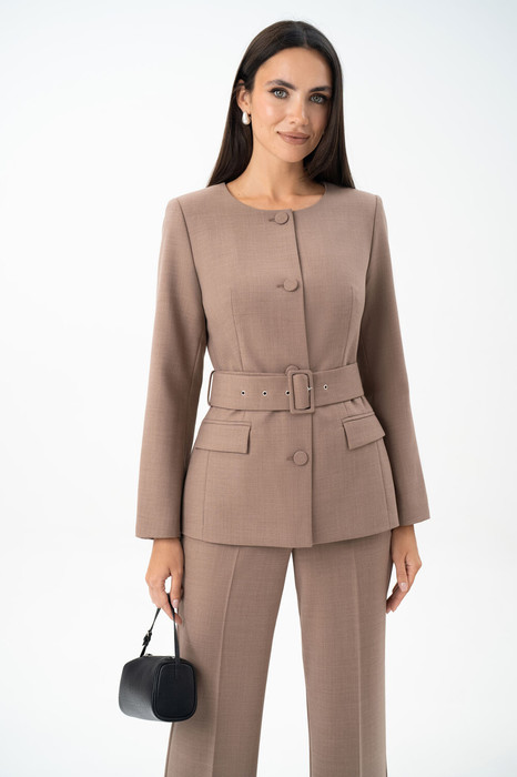 Костюм женский двухпредметный из костюмной ткани, состоит из жакета полуприлегающего силуэта  на подкладке и прямых брюк со стрелками. В комплект к костюму идет съемный застегивающийся пояс с пряжкой. Костюм предназначен для повседневной носки.