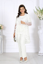 Жакет полуприлегающего силуэта, на подкладке, с центральной бортовой застежкой на 4 петли и 4 пуговицы (размер и цвет фурнитуры может незначительно отличаться от фото). Перед со смещенными рельефными швами, идущими из пройм вниз, с нагрудными вытачками, выходящими из рельефных швов к центрам, в нижних частях с прорезными карманами с клапанами. Спинка с рельефными швами и средним швом. Рукава втачные, двухшовные, длинные. Горловина оформлена воротником пиджачного типа. Концы воротника и лацканов закруглены. По воротнику, лацканам, бортам, клапанам прострочена отделочная строчка ш. 0,7 см.