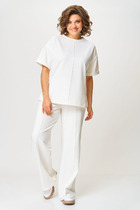 Костюм женский двухпредметный, состоящий из жакета и брюк. Жакет полуприлегающего силуэта с центральной бортовой застёжкой на одну петлю-пуговицу до линии перегиба лацкана. Перед с талиевой вытачкой и прорезным карманом с листочкой с втачными концами. Спинка со средним швом. Рукав втачной двухшовный длинный. Воротник пиджачного типа. Брюки классического кроя, слегка зауженные к низу с притачным поясом с резинкой по задним половинкам брюк. Брюки с наклонным к боковому шву карманом и двумя фигурными хлестиками на одну пуговицу по поясу передних половинок. Застёжка на тесьму - молнию и одну петлю-пуговицу по поясу. Низ брюк имеет фигурную форму - укорочена по передним половинкам и удлинённые по задним. Длина жакета по спинке - 59 см. Длина рукава - 61 см. Длина брюк по боковому шву - 96 см.