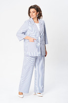 Костюм женский двухпредметный, состоящий из жакета и юбки. Жакет полуприлегающего силуэта с центральной бортовой застежкой на 5 петель-пуговиц. По переду обработаны нагрудные вытачки и по 3 защипа-складки по талии. Спинка со средним швом и двумя защипами-складками с двух сторон. Горловина V-образной формы, с цельнокроенной стойкой и с отрезным швом по спинке. Рукав втачной двухшовный длинный. Юбка заужена к низу, длиной за колено. Переднее полотнище с талиевыми вытачками. Заднее полотнище со средним швом, заканчивающимся шлицей, и с застежкой на потайную тесьму-молнию. Заднее полотнище также с талиевыми вытачками по 2 шт.