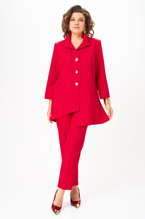 Комплект женский, состоящий из туники и брюк. Туника А-образного силуэта с центральной застежкой на планку до подреза на 3 декоративные петли-пуговицы. Перед с нагрудной вытачкой и фигурными подрезами. Спинка с горизонтальной кокеткой и двумя складками. В боковых швах обработаны разрезы. Низ переда ассиметричен и слегка разведен. Рукава втачные одношовные длиной 3/4 с защипом, имитирующим манжет. Воротник-стойка. Брюки классического кроя, зауженные к низу с притачным поясом сзади на резинке. Застежка на тесьму-молнию в среднем шве передних половинок и 1 петлю-пуговицу по поясу. На брюках заутюжены канты.