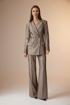 Комплект женский двухпредметный, состоящий из жакета и брюк. Жакет полуприлегающего силуэта с центральной бортовой застежкой на 6 петель-пуговиц. Перед с отрезным бочком, нагрудной вытачкой и накладными карманами фигурной формы. Горловина ии крой борта имеют закругленную форму. Края горловины, борта, низа изделия и рукавов, а также карманы окантованы контрастной киперной тесьмой. Спинка со средним швом. Рукав втачной двухшовный, длинный. Брюки классического кроя, расширенные от бедра, с заутюженными кантами и с притачным поясом сзади на резинке. По краям пояса передних половинок брюк настрочена узкая киперная тесьма. Застежка на тесьму-молнию в передних половинках и петлю-пуговицу по поясу.