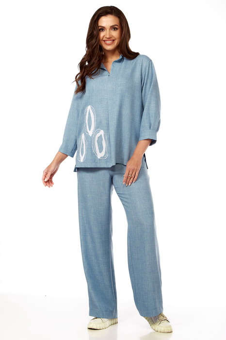 Костюм женский, состоит из туники и брюк. Туника без застёжки с разрезом по середине горловины переда, с односторонней складкой и вышивкой по переду. Рукав одношовный длиной 3/4 по низу с двумя односторонними складками. Горловина круглая с рюшей, обработана обтачкой. Брюки прямые от бёдер с застёжкой в средних срезах передних половинок на тесьму "молнию", гульфик и откосок. Притачный пояс на резинке и одна петля, пуговица. Длина туники по спинке - 64,5 см. Длина рукава - 44,5 см. Длина брюк по передней части - 101 см.