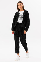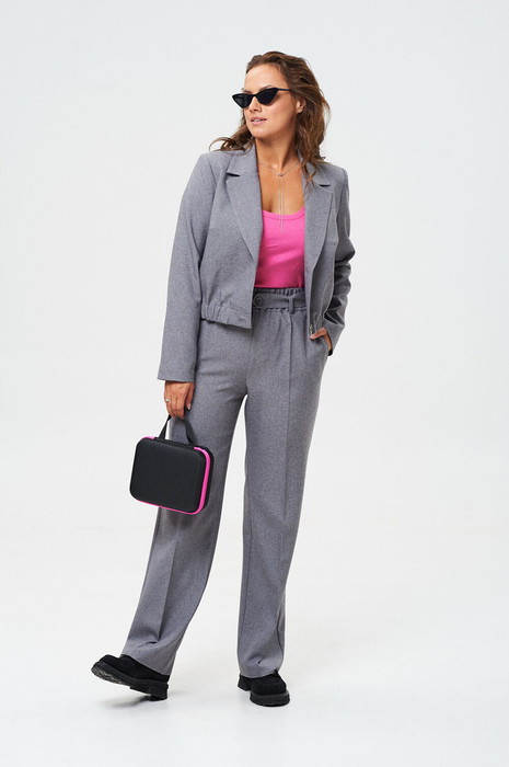 Костюм женский двухпредметный, состоящий из укороченного жакета на подкладке и брюк. Жакет с центральной бортовой застёжкой на две петли-пуговицы до линии перегиба лацкана прямого силуэта с нагрудной вытачкой, выходящей из бокового шва и резинкой по низу переда и частично по спинке. На спинке настрочен декоративный эменет. Рукава втачные длинные одношовные. Воротник пиджачного типа. Брюки классического кроя прямого силуэта со стрелками и притачным поясом на широкой резинке. Застёжка на потайную тесьму-молнию в боковых швах. На поясе настрочены шлёвки для съёмного пояса, застёгивающегося на 1 петлю-пуговицу. В брюках обработаны карманы, наклонные к боковому шву. Длина жакета по спинке - 49 см. Длина рукава - 60,5 см. Длина брюк - 100 см.